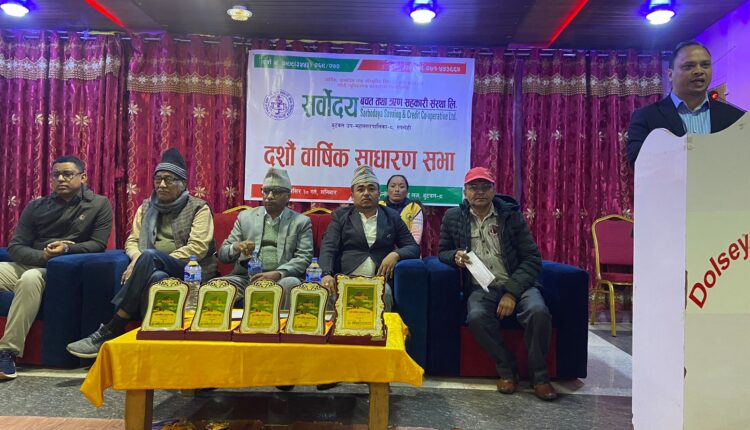 बुटवल । बुटवल उप-महानगरपालिका -८ मा अवस्थित सर्वोदय बचत तथा ऋण सहकारी संस्था लिमिटेडको १० औं बार्शिक साधारणसभा सनिवार बुटवलमा सम्पन्न भएको छ । संस्थाका अध्यक्ष लेखमान श्रेष्ठको अध्यक्षता, उपमहानगरपालिका सहकारी शाखाका प्रमुख गुनाखर खनालको प्रमुख आतिथ्यतामा भएको साधारणसभाले अध्यक्षको प्रतिबेदन र कोषाध्यक्ष बासुदेव शर्माले पेश गरेको प्रतिबेदन पारित गरेको छ । साधारणसभाको उद्घाटनका प्रमुख अतिथि खनाल , बरिस्ठ अधिबक्ता दिल साहनी, लुम्बिनी प्रदेश युबा परिषदका सदस्य सचिब जय प्रकाश भट्टराई, पुर्ब अध्यक्ष एवं अधिबक्ता ज्ञानु केसी,लायन्स क्लब अफ भृकुटी प्याराडाईका अध्यक्ष सबिना टन्डन, लेखा संयोजक टंकबहादुर रावत लगायतले सहकारीले सदस्यहरुको आर्थिक परिवर्तनमा टेवा पुर्याउन सफल भएको बताउनु भयो । उक्त सहकारीले साधारणसभाको अवसरमा लायन्स क्लब अफ भृकुटी प्याराडाईज संगको सहकार्यमा सदस्यहरुको मधुमेह परिक्षण गरिएको सचिब होमकान्त काफ्लेले जानकारी दिनुभयो ।