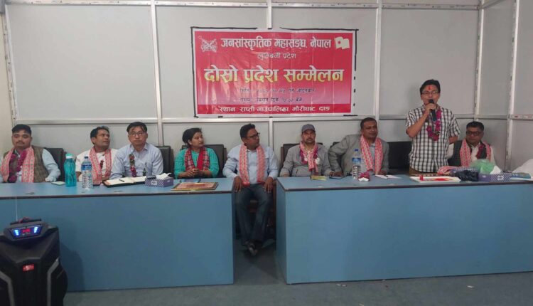देउखुरी । जनसास्कृतिक महासङ्घ नेपाल लुम्बिनी प्रदेशको दोस्रो सम्मेलनले सर्वसम्मत नयाँ कार्यसमिति निर्वाचित गरेको छ। वरिष्ठ छन्दकवि तथा मार्क्सवादी साैन्दर्यशास्त्री कविराज पौडेल अध्यक्षतामा नयाँ कार्य समिती चयन गरेको हो । जसको उपाध्यक्षमा शशिराम कार्की र बालकृष्ण भलामी,सचिवमा लेखा अधिकारी, सह-सचिवमा उत्रिचन हरिजन र काेषाध्क्षमा जमुना बिक चयन भएका छ्न । सदस्यहरुमा सुवास रिजाल,तारा राेकाय, केशव बेल्बासे,सुजन थारु,डाेलराज न्याैपाने,देवेन्द्र जिसी, खेम बिक,रन्जु बिक, केपी मगर,यश कुमार र कमला सुनार रहेका छ्न । सम्मेलनले आङ्गिक संगठन तर्फ जनकलाकार संघ,संयोजक -बालकृण भलामी,सहसंयोजक -पुर्णिमा जिसी,सदस्य- विशाल श्रेष्ठ, कोपिला मगर र गुड्डु यादवलाई चयन गरेको छ । त्यसैगरी लेखक संघतर्फ,अध्यक्ष : गोबिन्द खड्का,उपाध्यक्ष – गणेशा कार्की /यज्ञलाल सुवेदी,सदस्य : चन्द्रभूषण द्वेबे निर्वाचनद्वारा चयन भएका छन्।