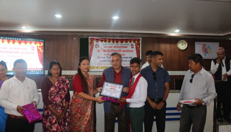 कञ्चन गाउापालिकाका अध्यक्ष नवराज ढकालको अध्यक्षता, रोजगार संयोजक ईश्वरी ज्ञवालीको संचालन तथा शिक्षा शाखा प्रमुख रमेश भूसालको सहजिकरणमा भएको कार्यक्रममा एस ई ई परीक्षामा उत्कृष्ट नतिजा ल्याउन सफल जनज्योति माध्यमिक बिद्यालयलाई समेत सम्मान गरिएको थियो।