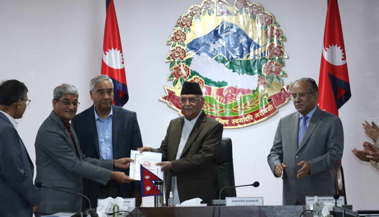 सिंहदरबारस्थित प्रधानमन्त्री तथा मन्त्रिपरिषद्को कार्यालय सिंहदरबारमा एक कार्यक्रमबीच एमाले अध्यक्ष एवं प्रधानमन्त्री केपी शर्मा ओली, कांग्रेस सभापति शेरबहादुर देउवा र माओवादी अध्यक्ष पुष्पकमल दाहाललाई प्रतिवेदन बुझाइएको छ । कार्यदलका संयोजक गृहमन्त्री रमेश लेखकले उक्त प्रतिवेदन बुझाउनु भयो ।
