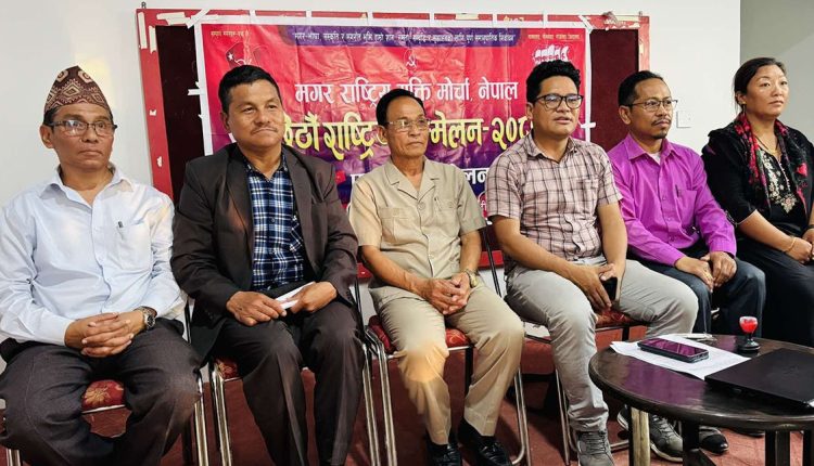 बुटवल। मगर राष्ट्रिय मुक्ति मोर्चा को छैठौ राष्टिय सम्मेलन बुटवलमा सम्पन्न भएको छ। बिहीबार बुटवलमा सम्पन्न महाधिवेशनले दीपक थापा चर्ती मगरको अध्यक्षतामा १५१ सदस्यीय नयाँ कार्यसमिति चयन गरेको हो वरिष्ठ उपाध्यक्षमा माधव दर्लामी मगर, उपाध्यक्षहरूमा चिनीमाया काला मगर, मीनबहादुर घर्ती मगर, टोपबहादुर दर्लामी मगर, लीला सोमै मगर, छमाया थापा मगर, लोकेन्द्र थापा मगर, अनिता थापा मगर, हिराबहादुर थापा मगर, सबिना बुढामगर, होमराज खपाङगी मगर, भक्तबहादुर लुङगेली मगर,सारदा पुन मगर र मालबहादुर बुढा मगर महासचिवमा जीवन प्रवेश रोका मगर, उपमहासचिवहरूमा तीर्थ थापा मगर, विशाल पुन मगर, मनोज राना मगर, खगेन्द्र पुन मगर, सिद्धबाबा थापा मगर रहनुभएको छ। । सचिवहरूमा वीरमान घर्ती मगर, टिकासरी बुढा मगर, हरिबहादुर थापा मगर, धनबहादुर पुन मगर, चन्द्रबहादुर बुढाथोकी मगर, केशव थापा मगर, यम खपाङगी मगर, दीपक थापा मगर, टुगा थापा मगर र कोषाध्यक्षमा अम्बिका खुलाल मगर लगायत रहनुभएको छ । नवनिर्वाचित अध्यक्ष चर्ती मगर गण्डकी प्रदेशका पूर्व वन तथा वातावरण मन्त्री समेत हुनुहुन्छ ।