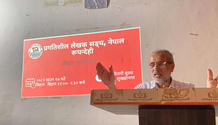 बुटवल । प्रगतिशील लेखक सङ्घ, रूपन्देहीद्वारा शनिबार “लेखन कार्यशाला” सम्पन्न भएको छ ।लेखकको सिर्जनशील चेतनालाई धारिलो बनाउने, लेखन यात्रामा थप निखारता ल्याउने उद्देश्यका साथ कार्यशाला कार्यक्रम गरिएको हो ।कार्यक्रमको पहिलो सत्रमा अग्रज कवि तथा समालोचक ऋषिराम भुसालले “कविता के हो र कसरी लेख्ने ” भन्ने विषयमा प्रस्तुति दिनुभयो ।