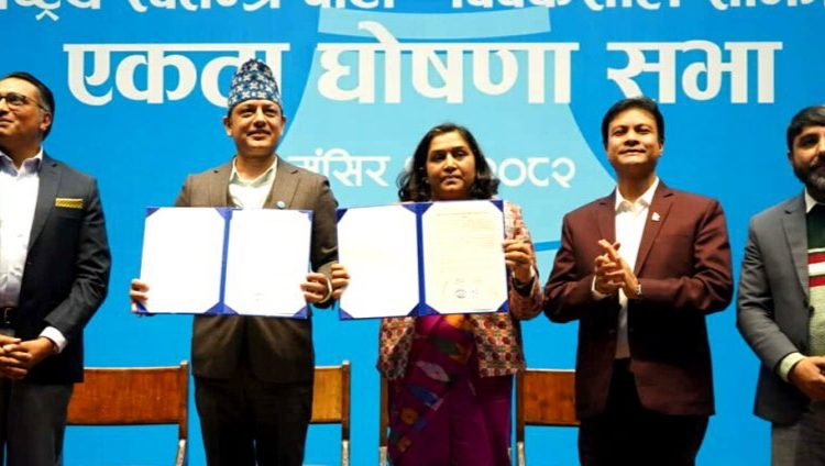 काठमाडौं । राष्ट्रिय स्वतन्त्र पार्टी (रास्वपा) र विवेकशील साझा पार्टीबीच एकता घोषणा भएको छ । काठमाडौंमा आयोजित एकता घोषणा सभामा दुई दलका नेताहरूले एकीकरणसम्बन्धी सहमतिमा हस्ताक्षर गरेका छन् ।