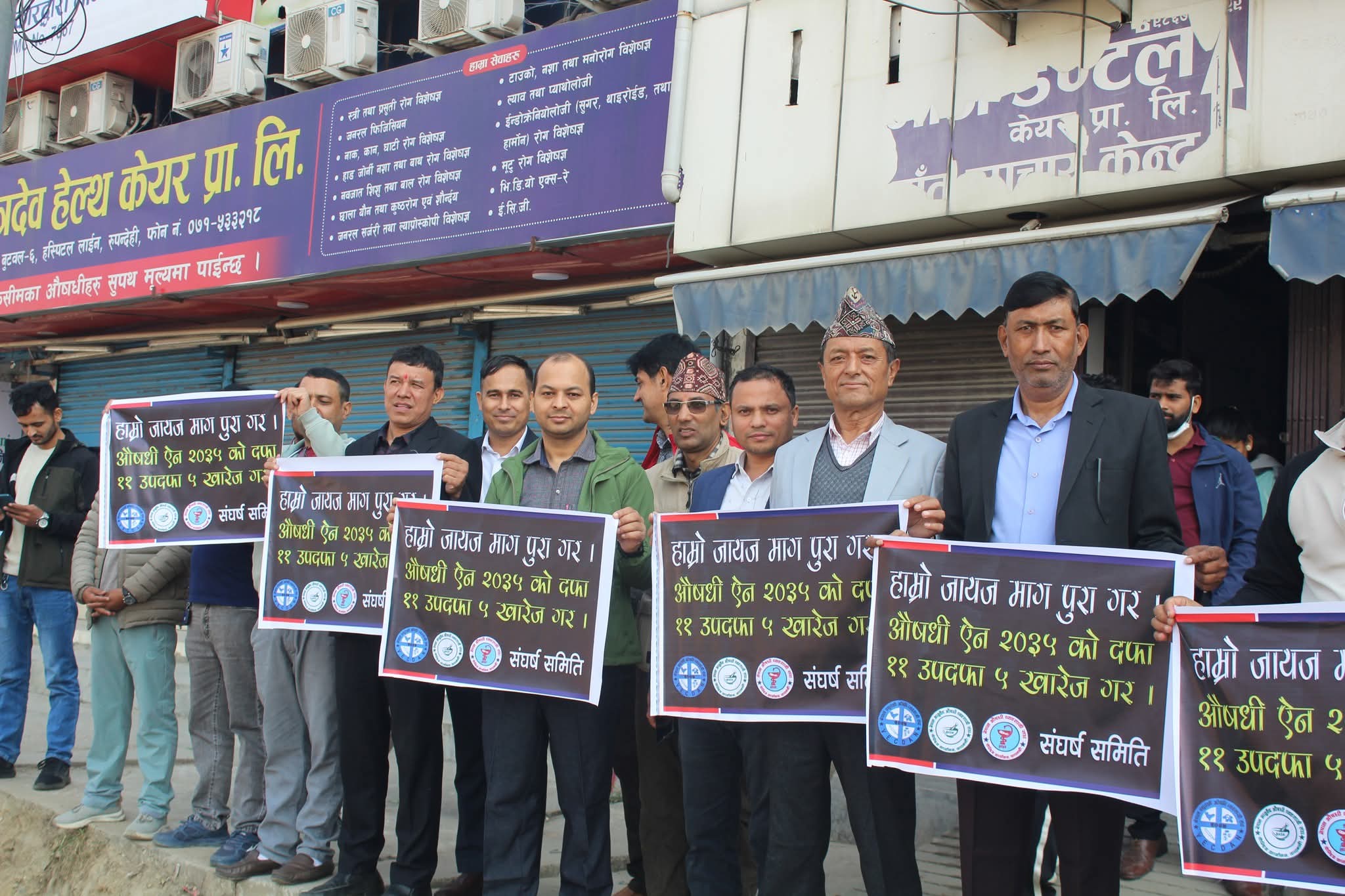 नेपाल औषधि व्यवसायी संघ , नेपाल आयुर्वेद औषधि व्यवसायी संघ र नेपाल पशुपन्छी औषधि व्यवसायी संघ, मेलानको संयुक्त रुपमा औषधी ब्यवसायीहरु आन्दोलन गरिरहेका छ्न । नेपाल औषधि व्यवसायी संघ जिल्ला शाखा रुपन्देही तथा लुम्बिनी प्रदेश आज पनि बिरोधको जारी राख्यो । संघीय संसदबाट पारित भई साउन १४ गतेदेखि लागू भएको नयाँ प्रावधानले औषधी व्यवसायीहरूलाई गम्भीर समस्यामा पारेको ब्यवसायीहरुले बताएका छ्न । संशोधित व्यवस्था अनुसार तोकिएको समयसीमाभित्र उत्पादन अनुज्ञापत्र, सिफारिसपत्र वा प्रमाणपत्र नवीकरण नगरे दोब्बर दस्तुर तिरेर ३० दिनभित्र नवीकरण गर्न सकिने उल्लेख गरिएको छ । उक्त अवधि नाघेमा प्रमाणपत्र ‘स्वतः रद्द’ हुने प्रावधानले दशकौँदेखि सञ्चालनमा रहेका व्यवसाय समेत बन्द हुने अवस्था सिर्जना भएको संघले जनाएको छ ।