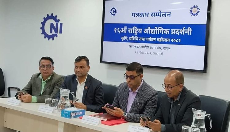 आगामी पुस ३ गतेदेखि १७ गतेसम्म बुटवलमा १६औँ राष्ट्रिय औद्योगिक प्रदर्शनी, कृषि, प्रविधि तथा पर्यटन महोत्सव हुन लागेको हो । औद्योगिक प्रदर्शनीका विषयमा काठमाडौंमा पत्रकार सम्मेलन गर्दै संघले १६औँ राष्ट्रिय औद्योगिक प्रदर्शनी, कृषि, प्रविधि तथा पर्यटन महोत्सव २०८२ को नारा ‘समृद्ध नेपाल निर्माणको आधार, स्वदेशी उद्यमशिलताको विस्तार’ रहेको छ । संघले २०४५ सालमा नेपालमै पहिलो पटक र २०५३ सालदेखि निरन्तर औद्योगिक प्रदर्शनी आयोजना गरिएको जनाएको छ । बुटवल स्थित अन्तराष्ट्रिय प्रदर्शनी केन्द्रमा आयोजना हुने औद्योगिक प्रदर्शनीमा स्वदेशी उत्पादन, नयाँ प्रविधि, पर्यटन तथा कृषि उत्पादनसँग सम्बन्धित वस्तुहरूका लागि छुट्टाछुट्टै १० वटा पेभिलियन हुनेछन् ।