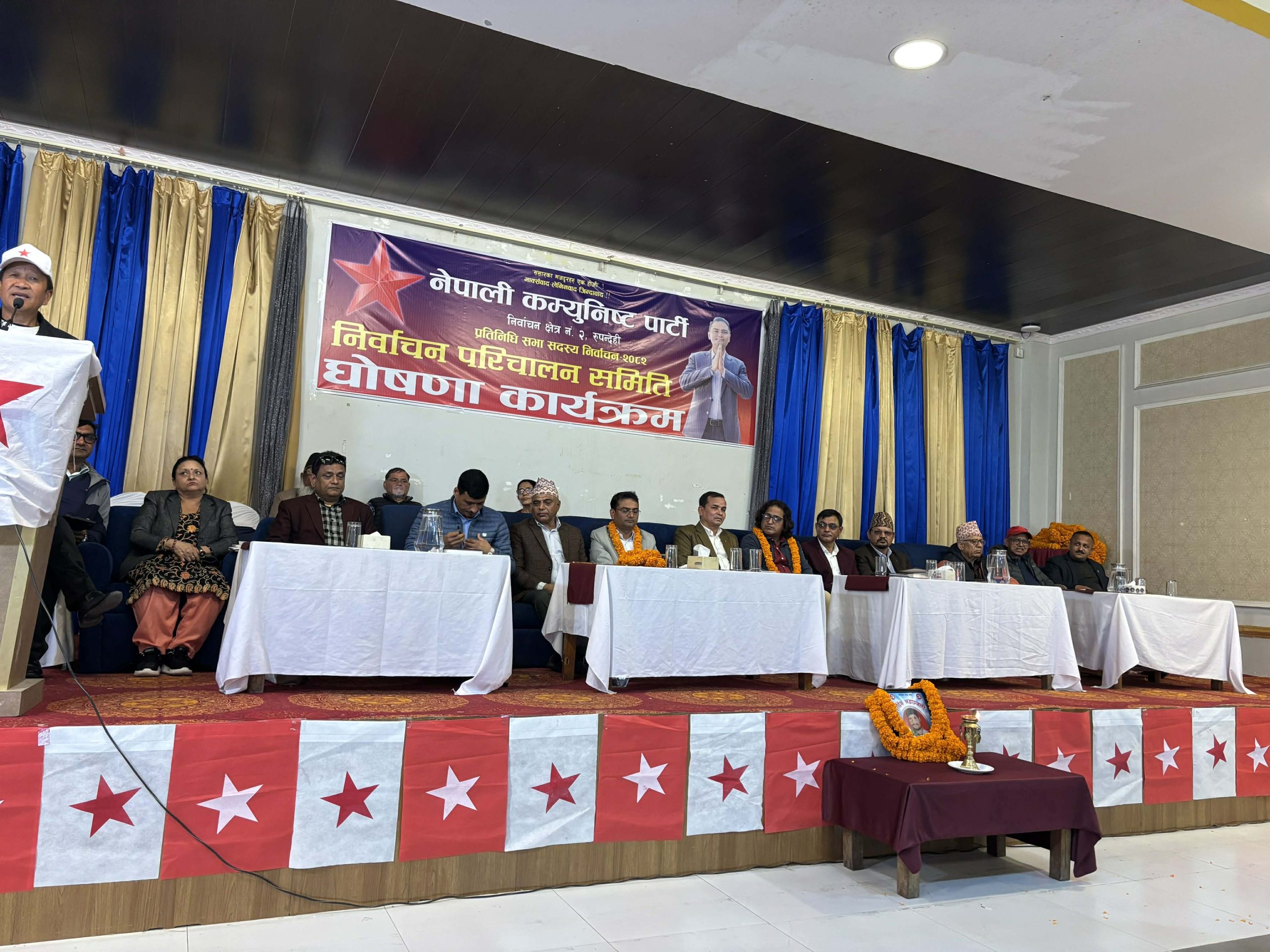 आगामी फागुन २१ गते हुने प्रतिनिधिसभा निर्वाचनलाई लक्षित गरी नेपाली कम्युनिष्ट पार्टी ( नेकपा ) ले रुपन्देहीको क्षेत्र नं २ ले गठन गरेको निर्वाचन परिचालन समिती घोषणा सभालाई आज बुटवलमा सम्बोधन गर्दै उहाँले देशलाई दुर्घटन हुनबाट रोक्न र जनताको अपेक्षा अनुसार बिकासको खाका कोर्न नेपाली कम्युनिष्ट पार्टीका उम्मेदवारहरुलाई बिजयी बनाउनु पर्ने बताउनु भयो ।