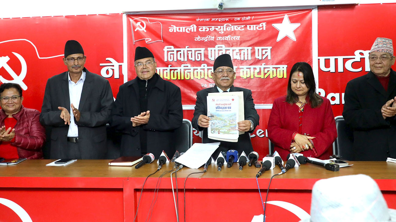 काठमाडौं । नेपाली कम्युनिस्ट पार्टीले आफ्नो चुनावी प्रतिबद्धतापत्र सार्वजनिक गरेको छ । आगामी ५ वर्षभित्र वार्षिक १० प्रतिशतभन्दा माथिको आर्थिक वृद्धिदर हासिल गर्ने लक्ष्यसहित आफ्नो प्रतिबद्धतापत्र सार्वजनिक गरेको हो ।